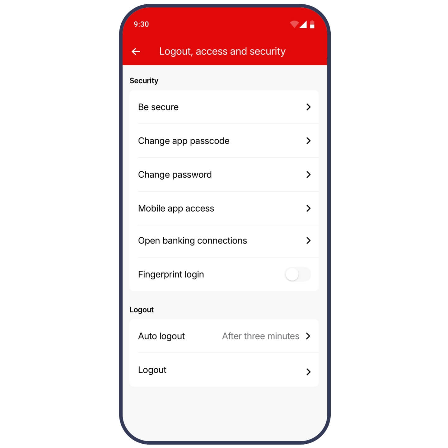 - Tap ‘Logout, access and security’