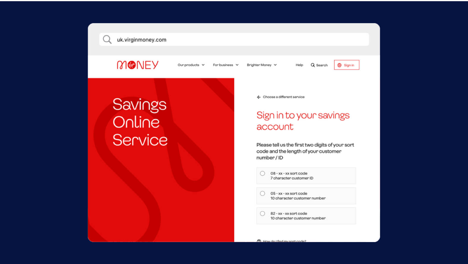 3. Select your sort code option and use your customer ID to sign in